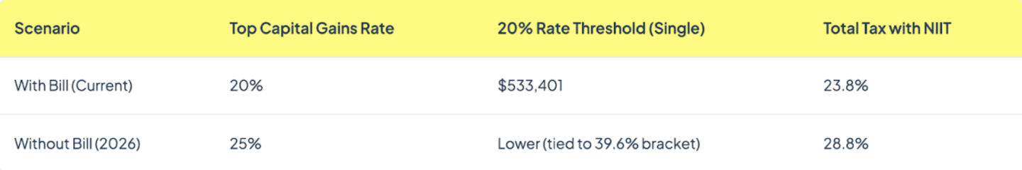 Without the bill, the top capital gains rate would have jumped to 25% for high-earners in 2026, and the income thresholds would have been tied to ordinary income brackets, meaning more taxpayers would have hit the top rate at lower income levels.