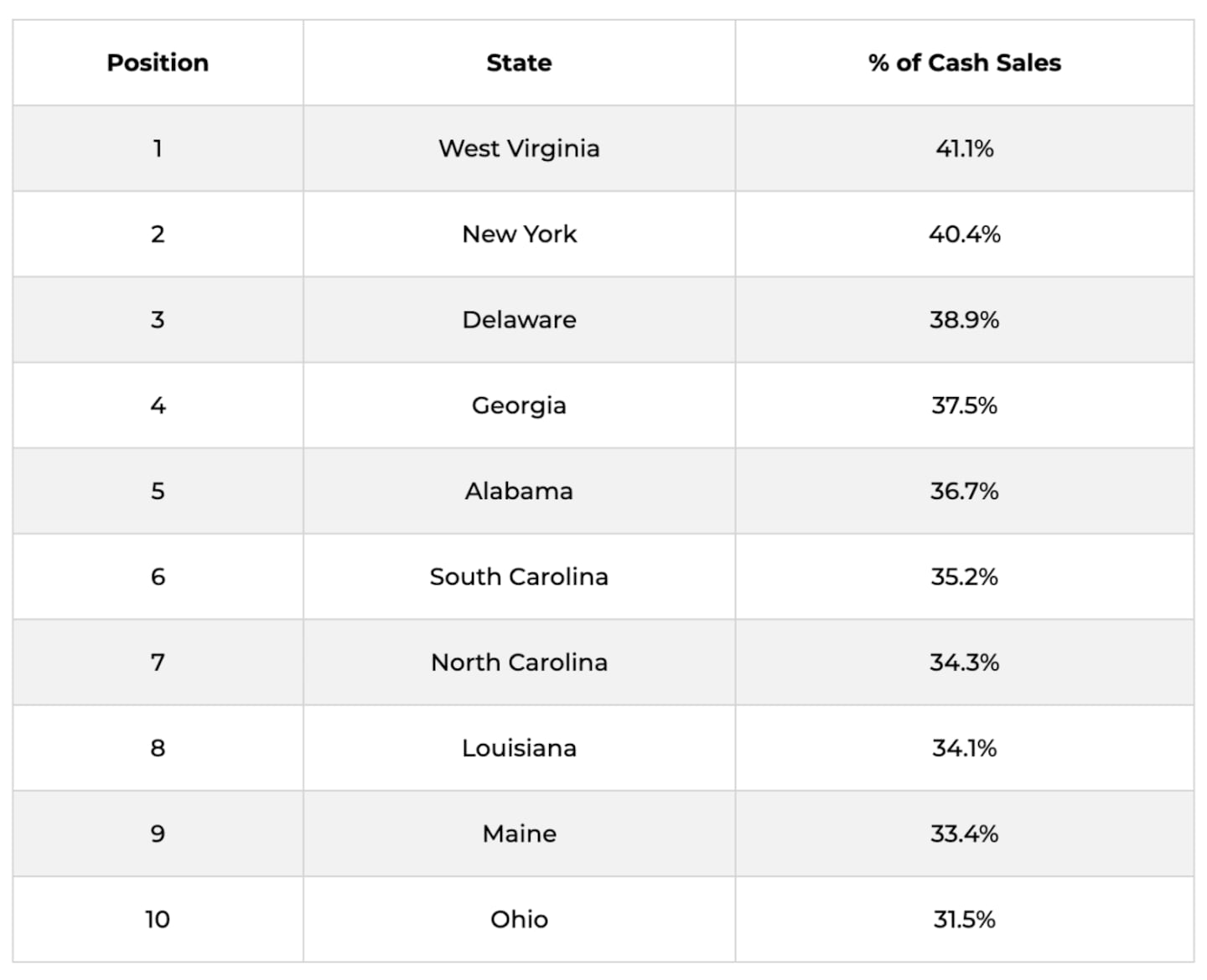 - West Virginia is the leader in cash sales, with about 41.1% of homes being sold for cash.