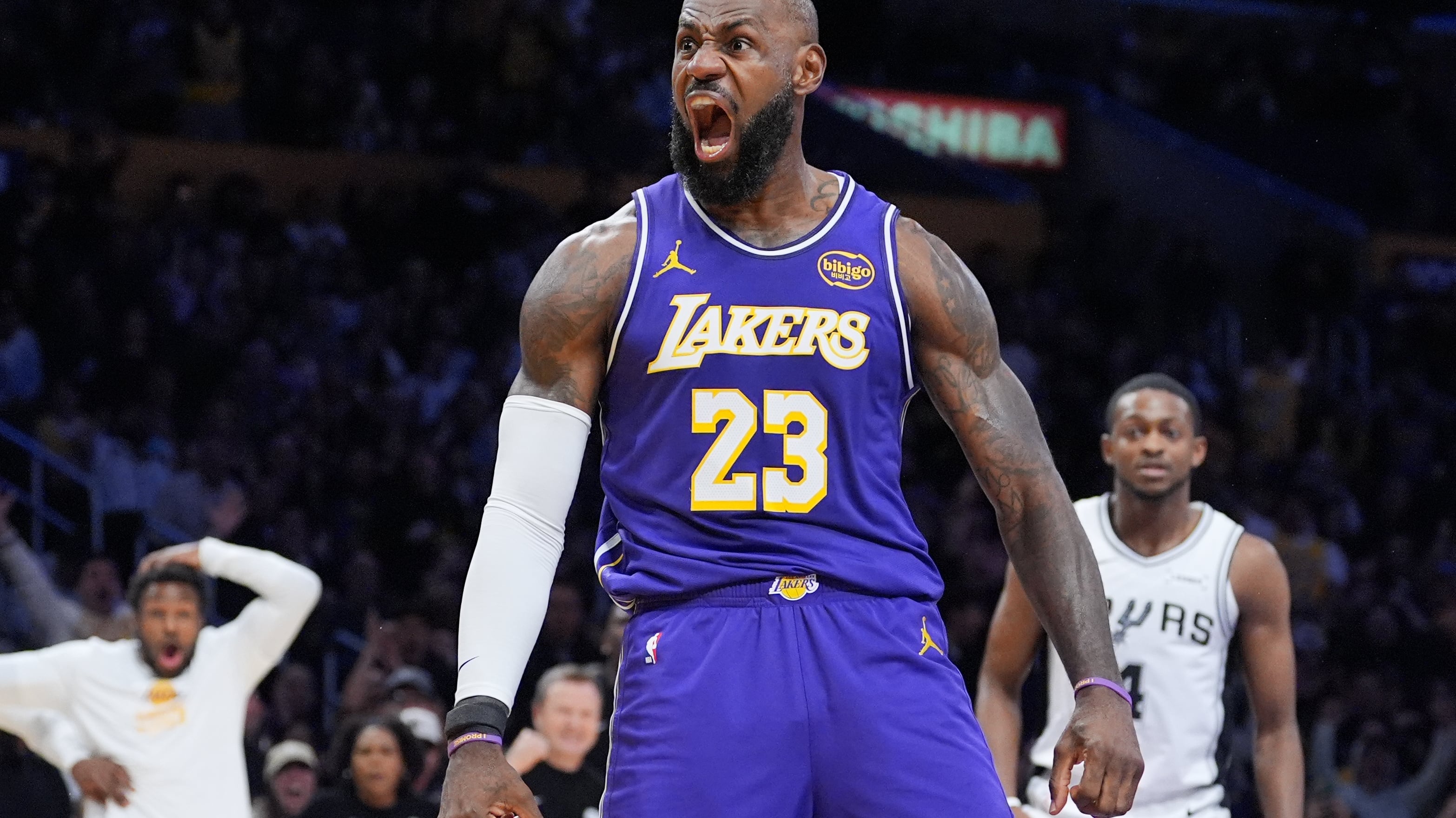 Spurs Lakers Basketball Los Angeles Lakers forward Lebron James (23) reacts after making a dunk during the first half of an NBA Cup basketball game against the San Antonio Spurs Wednesday, Dec. 10, 2025, in Los Angeles. (AP Photo/Jae C. Hong) (Jae C. Hong/AP)