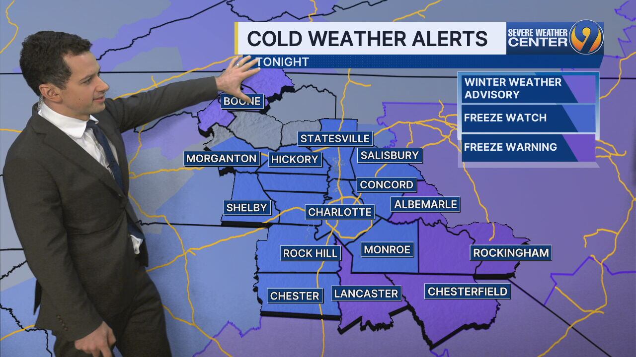 - We do have several alerts up for tomorrow’s cold air. Lows Monday night will drop into the 20s with widespread killing freeze likely.